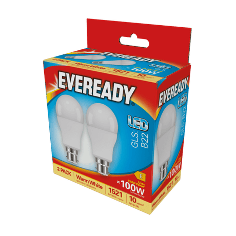Eveready LED GLS BC B22 3000k Warm White Pack 2 - 1521lm