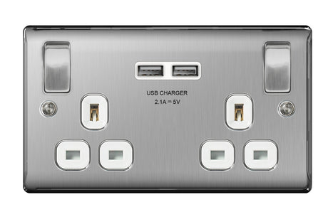 BG 13a 2 Gang Switch Socket & USB - Brushed Steel With White Inserts
