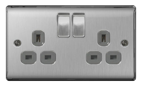 BG 13a 2 Gang Switch Socket - Brushed Steel With Grey Inserts