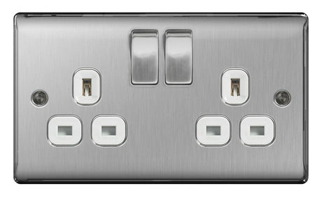 BG 13a 2 Gang Switch Socket - Brushed Steel With White Inserts