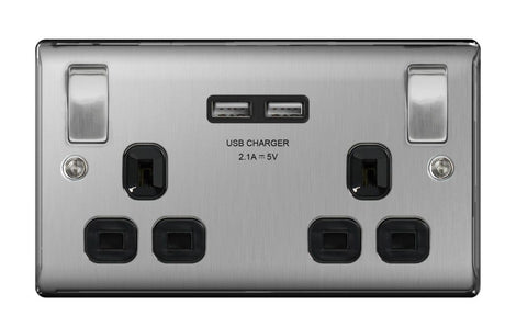 BG 13a 2 Gang Switch Socket & USB - Brushed Steel With Black Inserts