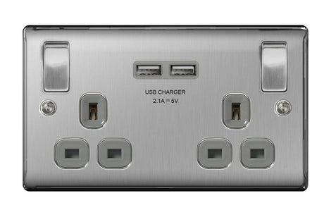BG 13a 2 Gang Switch Socket & USB - Brushed Steel With Grey Inserts