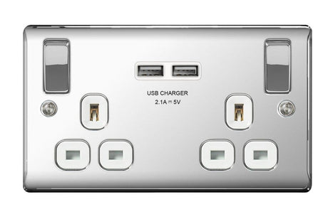 BG 13a 2 Gang Switch Socket & USB - Polished Chrome With White Inserts